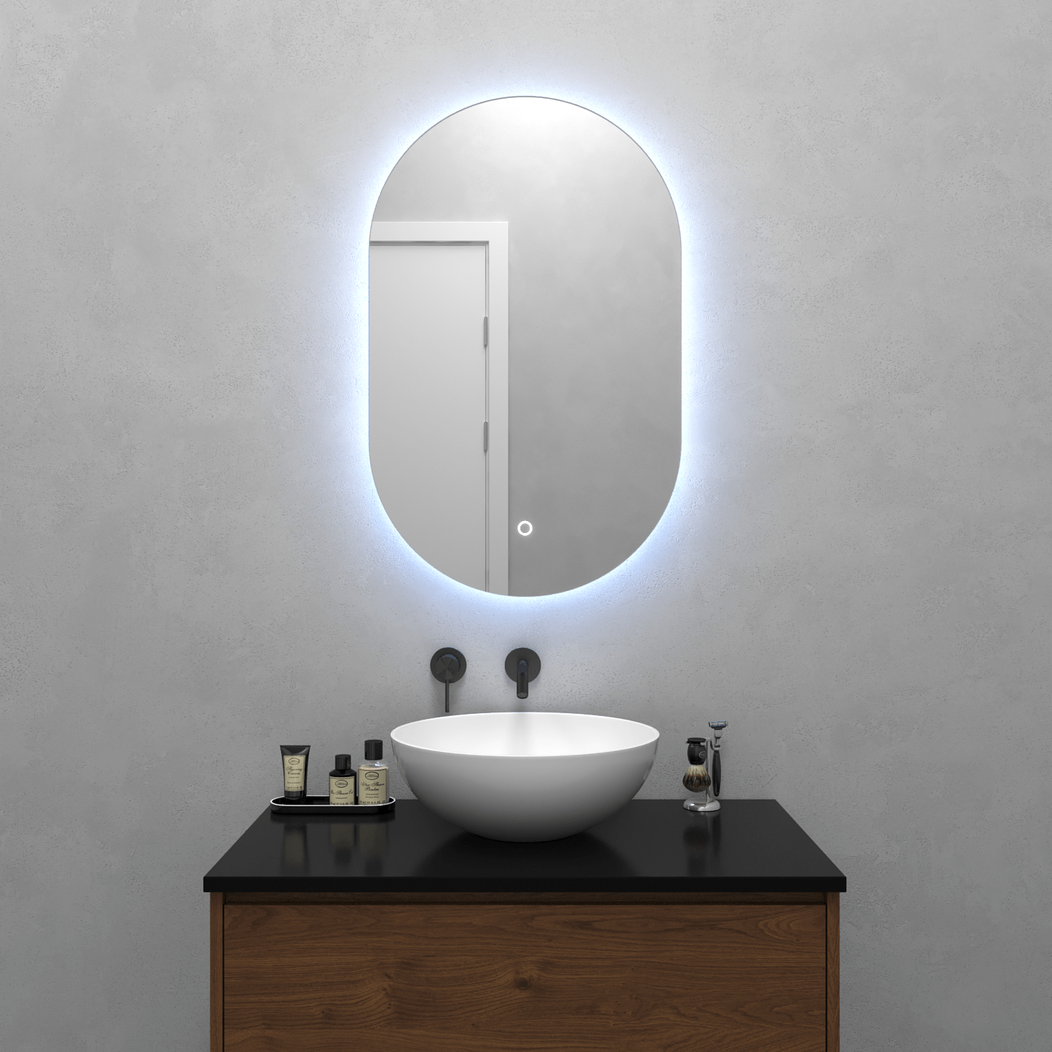 Безрамное зеркало овальной (капсульной) формы с контурной (тыльной) холодной подсветкой, свет 6000К. Подложка из высококачественного МДФ, светодиодная лента защищена матовым свето-рассеивателем от попадания пыли и влаги. Есть вывод 220W для подключения к сети, включение подсветки от сенсорной кнопки на зеркале.